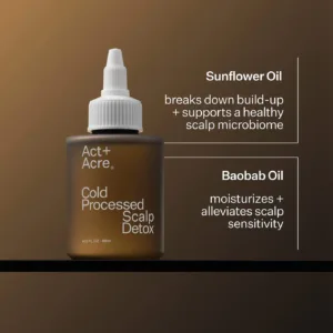 Cold Processed Scalp Detox Oil For Dry Scalp de Act+Acre es un tratamiento capilar sin enjuague diseñado para el cuidado del cuero cabelludo seco. Su formato en aceite permite una aplicación localizada que ayuda a mejorar la sensación de confort y suavidad en la raíz.