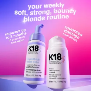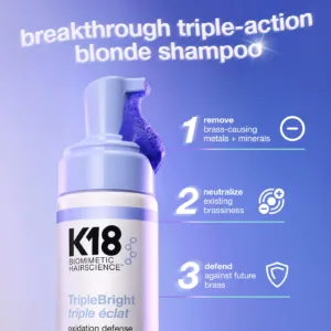 TripleBright Oxidation Defense Purple Shampoo Foam de K18 Biomimetic Hairscience es un shampoo en espuma diseñado para limpiar el cabello mientras ayuda a mantener el tono en cabellos rubios o decolorados. Su formato ligero en espuma permite una aplicación uniforme, proporcionando una experiencia de limpieza diferente y práctica.